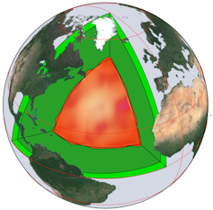 Le manteau terrestre, d’une épaisseur de 2900 km, est le géant de l’intérieur de la Terre : il représente 83 % de son volume et 67 % de sa masse. Sous le manteau se trouve le noyau, une boule de fer fondu agitée de mouvements rapides à l’origine du champ magnétique. Le manteau est également le siège de mouvements de convection, mais à des vitesses bien inférieures, de l’ordre du cm par an. Les compositions et propriétés du noyau et manteau terrestres sont aussi différentes que celles de la croûte et des enveloppes fluides en surface. On s’attend donc à ce que l’interface entre ces régions présente la même complexité que la surface de la Terre.