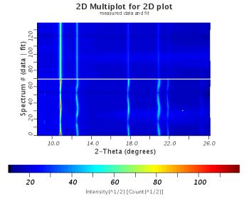 Once again, in the 2-D plot above, you can see that the intensity of the diffraction peaks change with orientation in the data, but not in the recalculated pattern. This is due to texture or lattice preferred orientations.