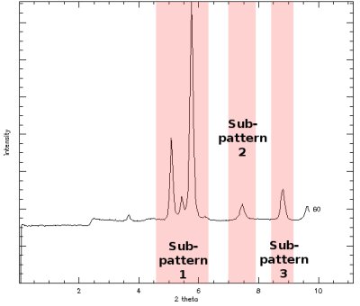In the example below, I decided that a set of 3 sub-patterns will be appropriate, the first include 3 peaks, the second and third only one. Peaks are far off the side of the diffractograms and will never get out of the diffraction image.